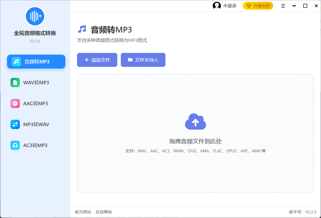 支持一键拖拽多个文件进行批量音频转换。添加文件或文件夹后,选择目标转换格式,如音频转MP3、WAV转MP3、AAC转MP3等,快速完成转换。支持WAV、AAC、AC3、WMA、OGG、M4A、FLAC、OPUS、APE、AMR等转换,操作简单便捷。